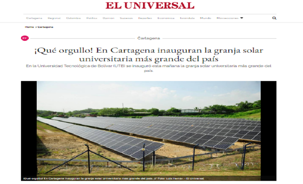El Universal – La UTB cuenta con la granja de energía fotovoltaica más grande de Colombia para un campus universitario. Hace un año se anunció el compromiso de realizar la granja solar y esto se logró en un tiempo menor al previsto.