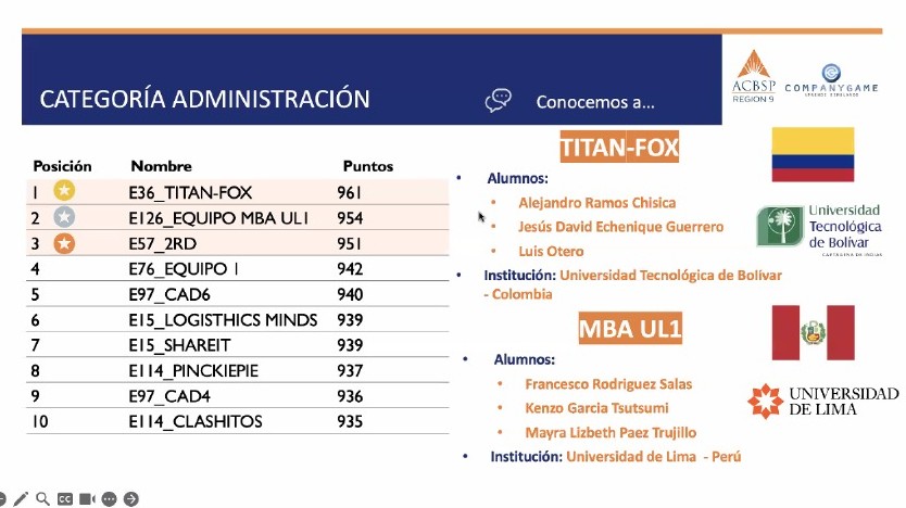 En total, participaron 9 países de la Región 9 de ACBSP, representados por 76 instituciones, 1037 equipos y más de 3070 estudiantes de programas de Administración y Negocios de toda Latinoamérica. En este exigente escenario, el equipo UTB E36 TITAN-FOX obtuvo el primer puesto, consolidándose como el mejor entre más de mil equipos.