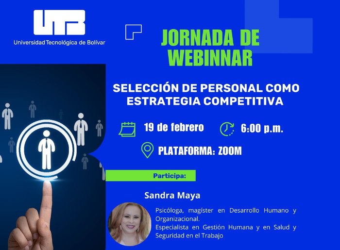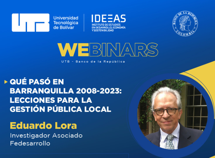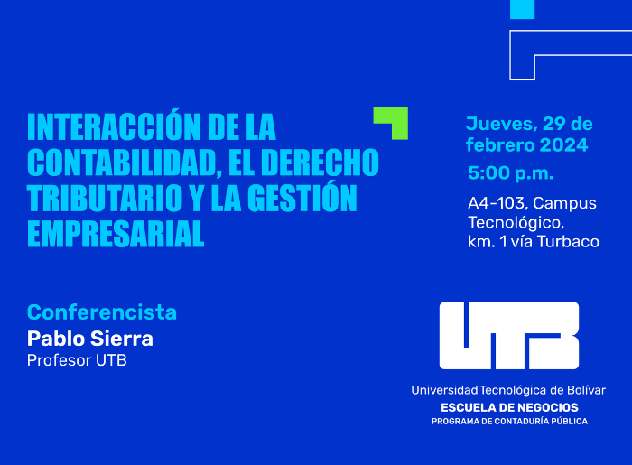 Agéndate con la UTB Entérate y participa en los eventos académicosde la Universidad Tecnológica de Bolívar Seleccione la categoría Marzo 6 Qué pasó en Barranquilla 2008-2023: Lecciones para la gestión pública local Ver más Marzo 5 y 6 II Encuentro Internacional de Facultades de Educación Ver más Febrero 29 Interacción de la contabilidad, el derecho tributario y la gestión empresarial Ver más Marzo 13 Cátedra inaugural y presentación del libro Cartagena: una ciudad abierta al mundo Ver más Febrero 22 Presentación Informe de Política Monetaria Ver más Febrero 19 Selección de personal como estrategia competitiva Ver más Ver más eventos