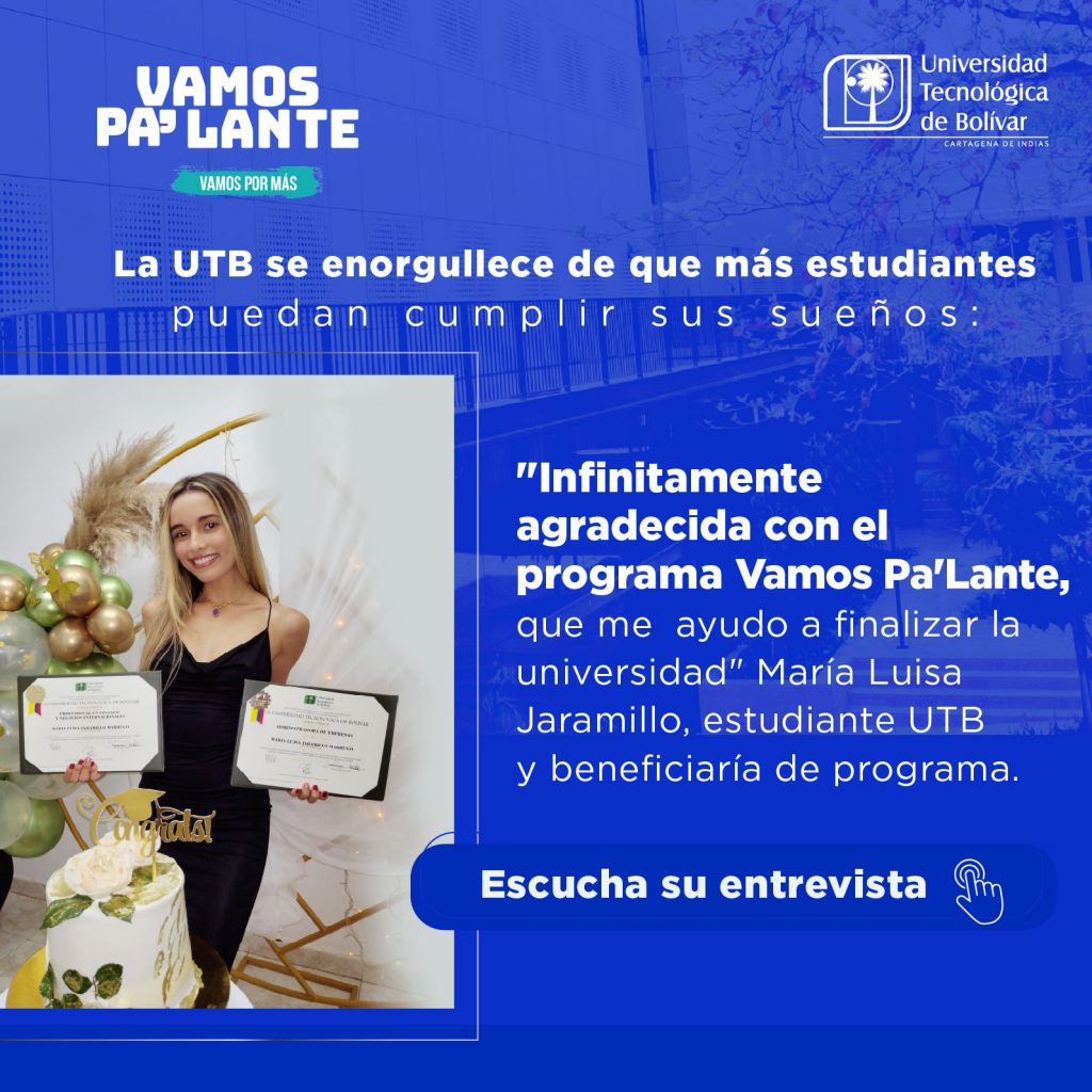 El programa ¡Vamos Pa’lante! busca que ningún obstáculo económico detenga el poder transformador de la educación. Esta iniciativa entrega “becas de rescate” del 95% del valor de la matricula y/o apoyo económico para sostenimiento dirigido a estudiantes nuevos sin posibilidades de acceder a la universidad y estudiantes continuos con excelente desempeño académico que se encuentran en riesgo de deserción debido a limitaciones financieras.