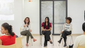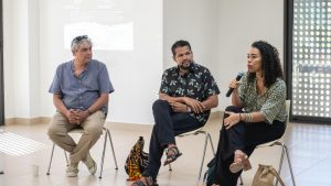 La jornada continuó con la participación de las egresadas de Comunicación Social Aura Henao y Valery Taborda, integrantes del equipo de la Fundación Gabo, en una conversación moderada por la profesora Mercedes Posada. Las comunicadoras compartieron sus reflexiones sobre los desafíos del periodismo en la era digital y en la defensa de la democracia, además de sus experiencias en la organización de varios Festigabo.
